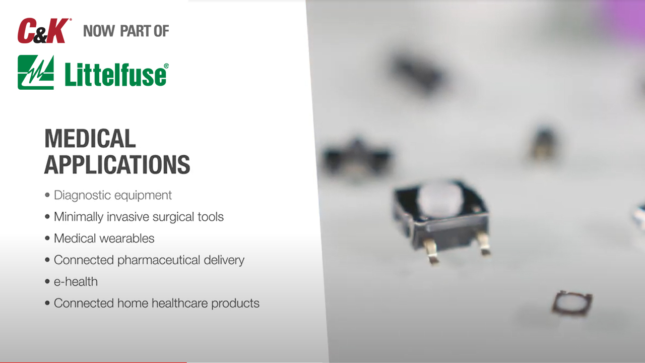 This video features C&K's switches for medical applications. C&K's switches support the full range of medical applications: diagnostic equipment, minimally invasive surgical tools, medical wearables, connected pharmaceutical delivery, e-health, and connected home healthcare products.